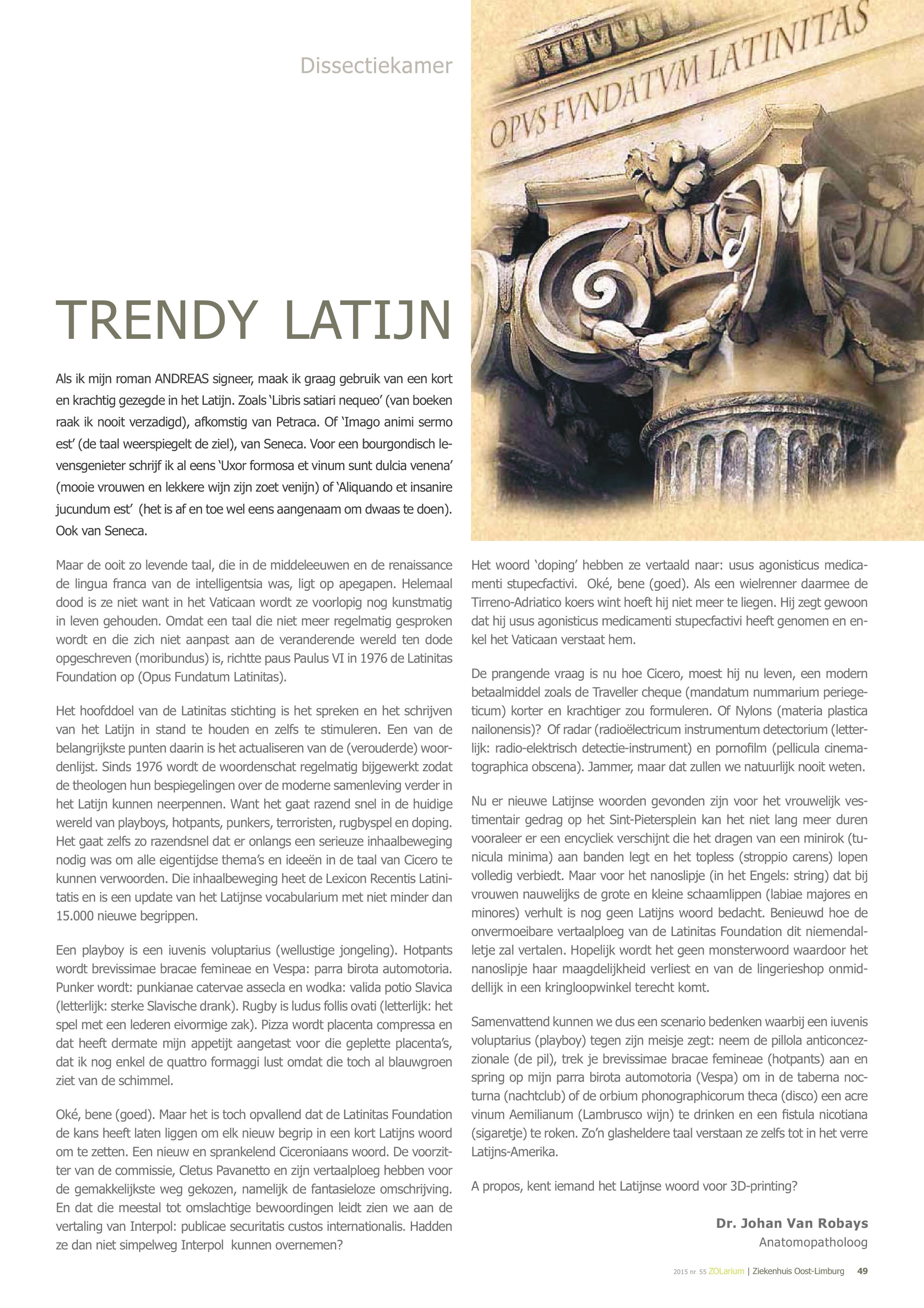 Sinds 2004 schrijft Johan telkens twee artikels in het driemaandelijks tijdschrift van het ZOL, het ZOLarium. Één artikel belicht een eponiem uit de medische wereld. Wie was bijvoorbeeld de man achter de ziekte van Alzheimer? Een tweede artikel situeert zich in de rubriek 'Dissectiekamer' en hier wordt een diverse waaier van onderwerpen 'aangesneden'.